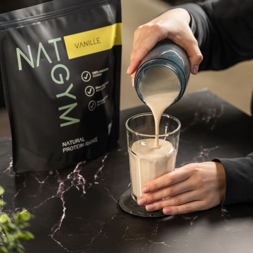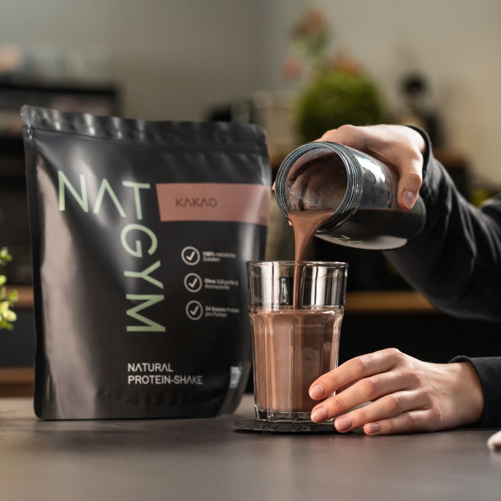 Mische 50 g Pulver (ca. 5 EL) mit 200 ml Milch/Milchersatz (oder 160 ml Wasser) in einem Mixbecher. Flüssigkeit zuerst, dann Pulver hinzufügen, um Klumpen zu vermeiden. Mindestens 15 Sekunden schütteln/mixen für eine optimale Konsistenz. Für eine festere Konsistenz einige Minuten stehen lassen. Am Boden kann sich brauner Vollrohrzucker absetzen.Häufig gestellte Fragen